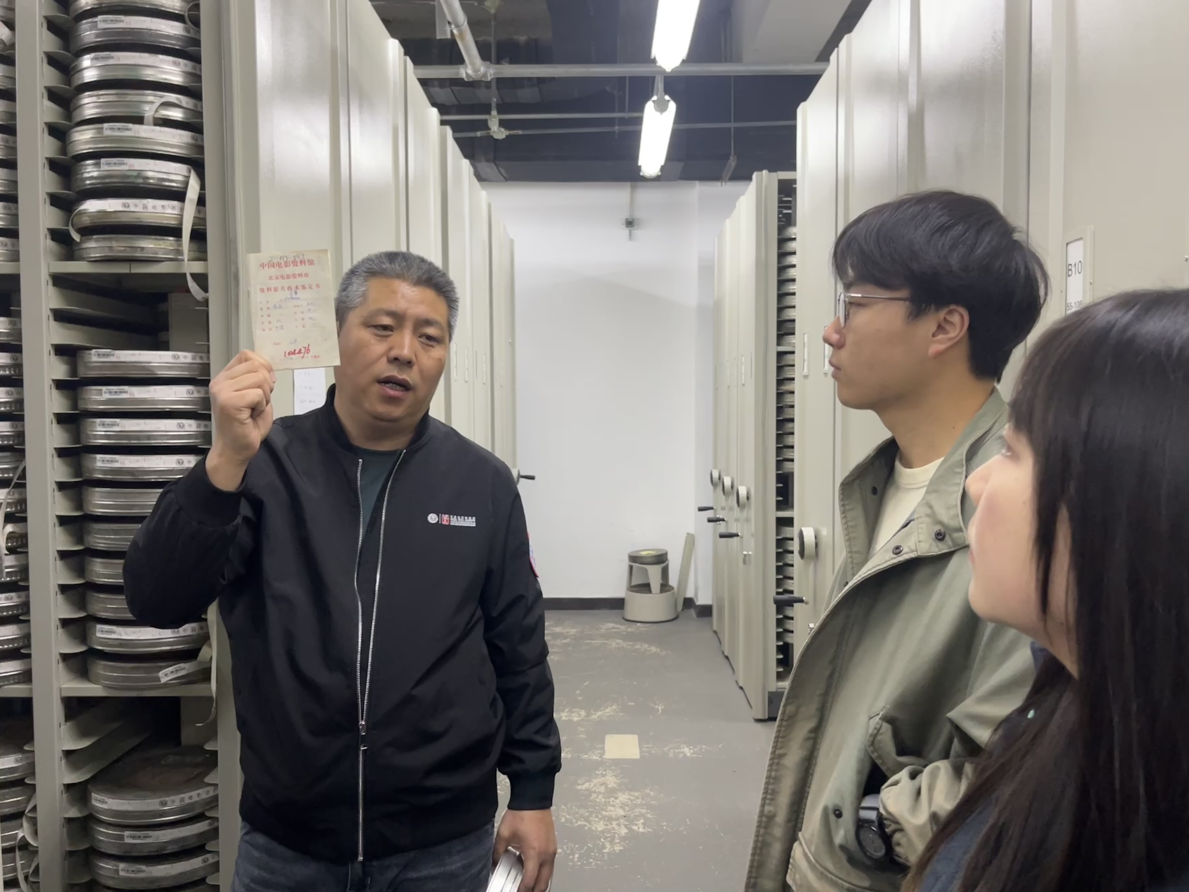 在王雷老师的带领下,同学们来到存放黑白胶片的库房。成千上万的胶片盒有序陈列在一排排的架子上,沉甸甸的胶片盒托举起的是历史与文化的重量。我们看到,每一本胶片都有着一张独特的“身份证”,详细记录了胶片信息以及出入库使用情况。
