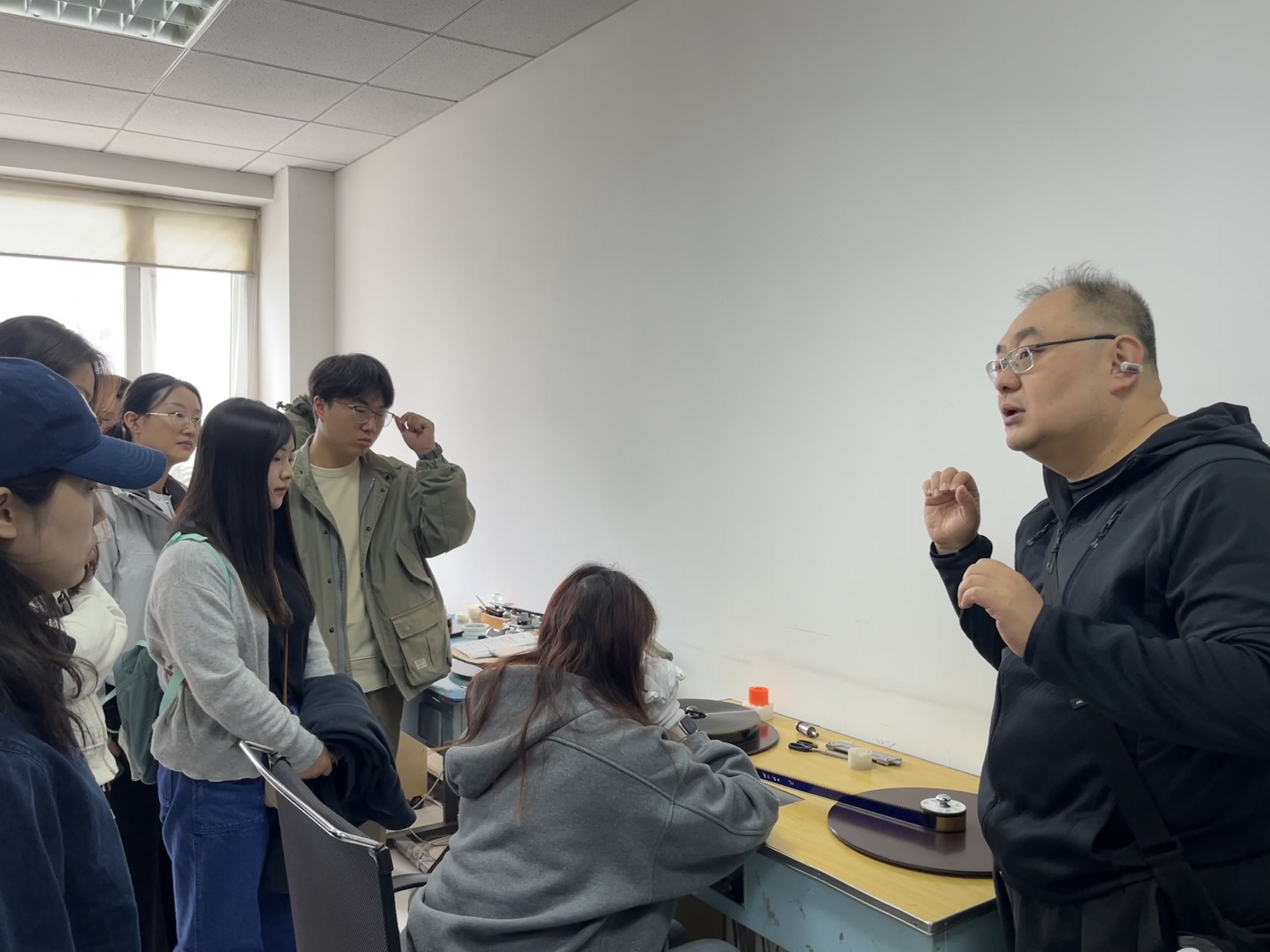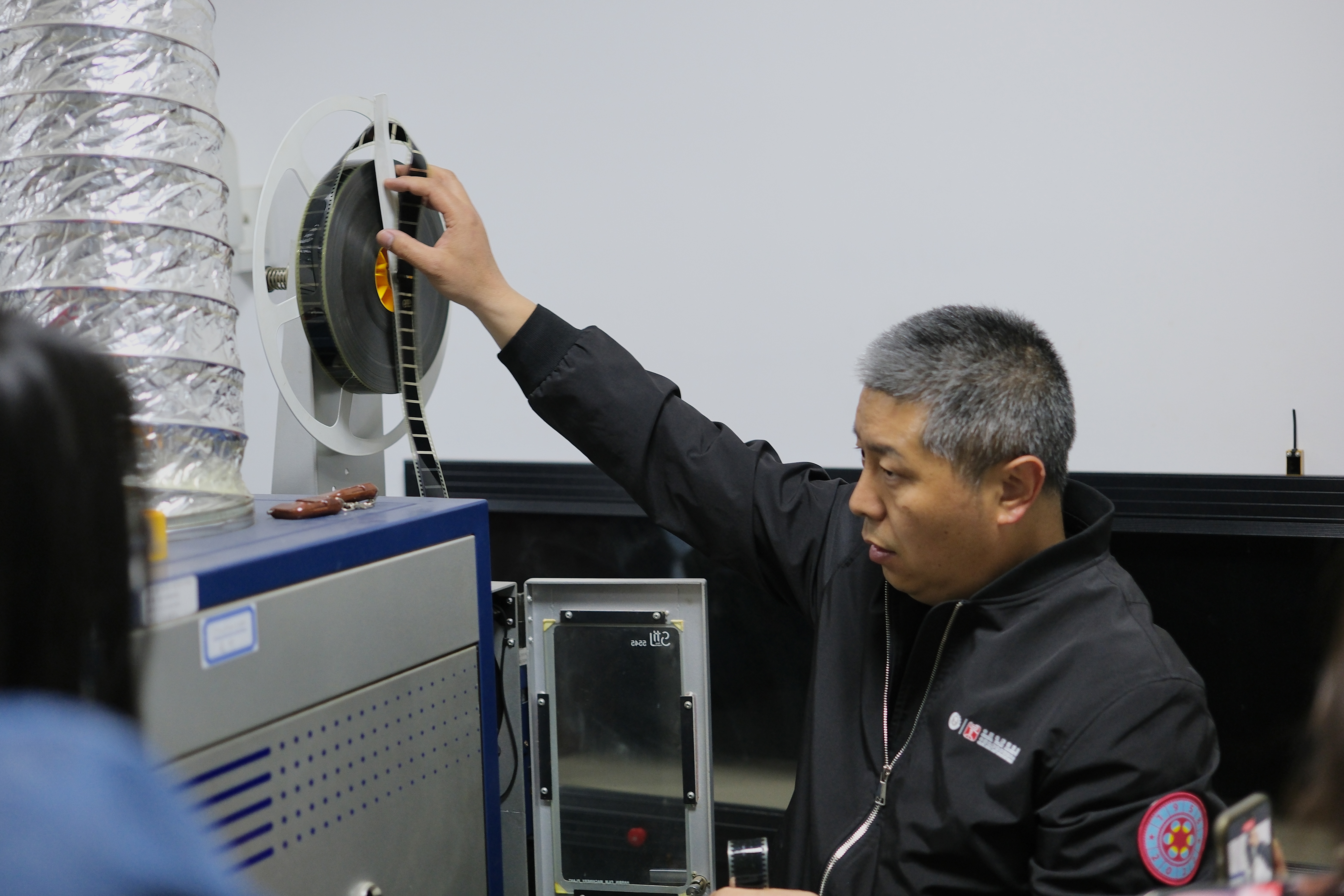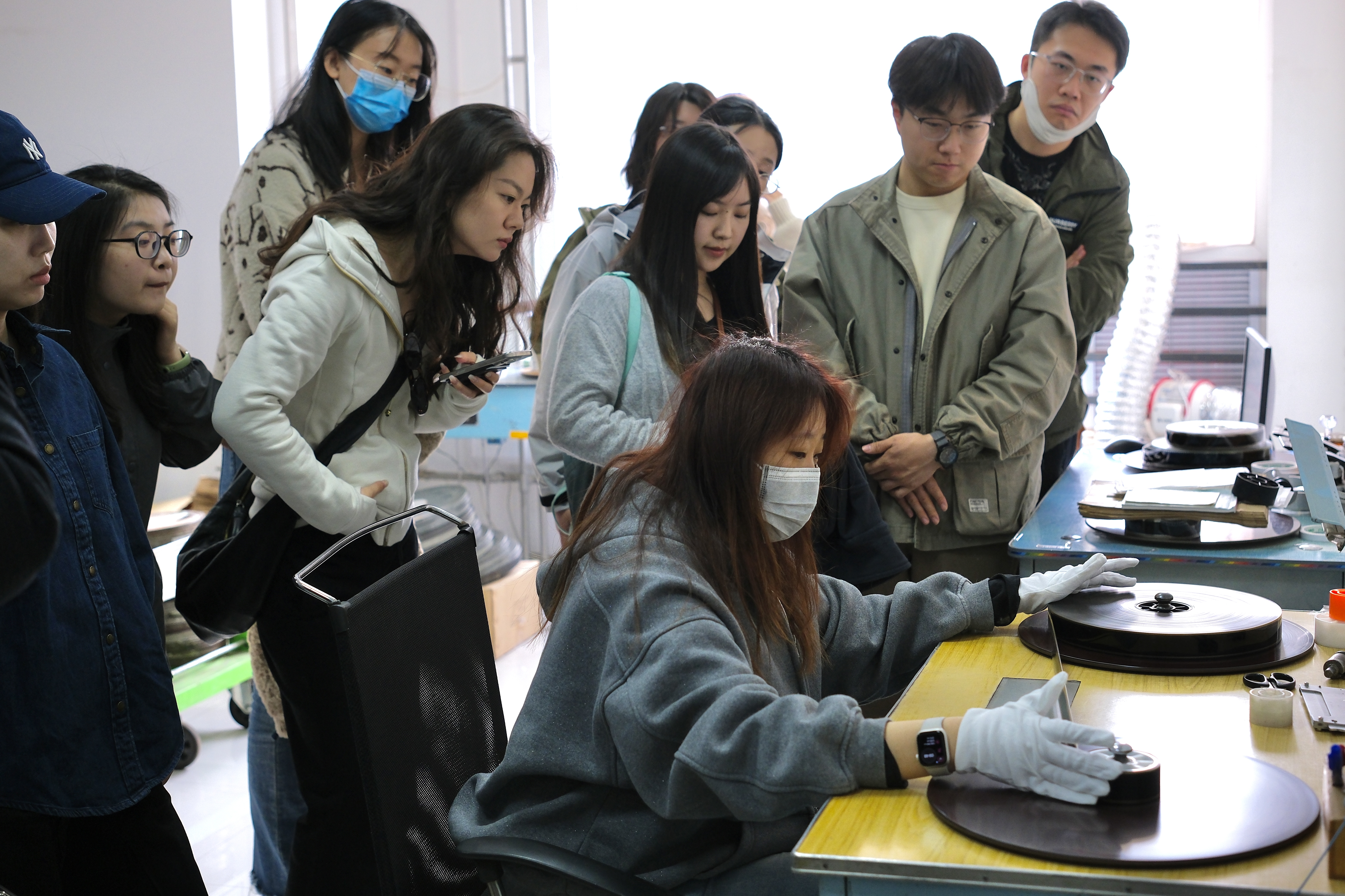 随后,同学们前往技术处理车间,观摩学习李念一老师的检片工作流程。成卷的胶片在检测台上不停旋转,李老师专注的神情倾注了她对胶片工作的热爱,深深感染了在场的每一位同学。
