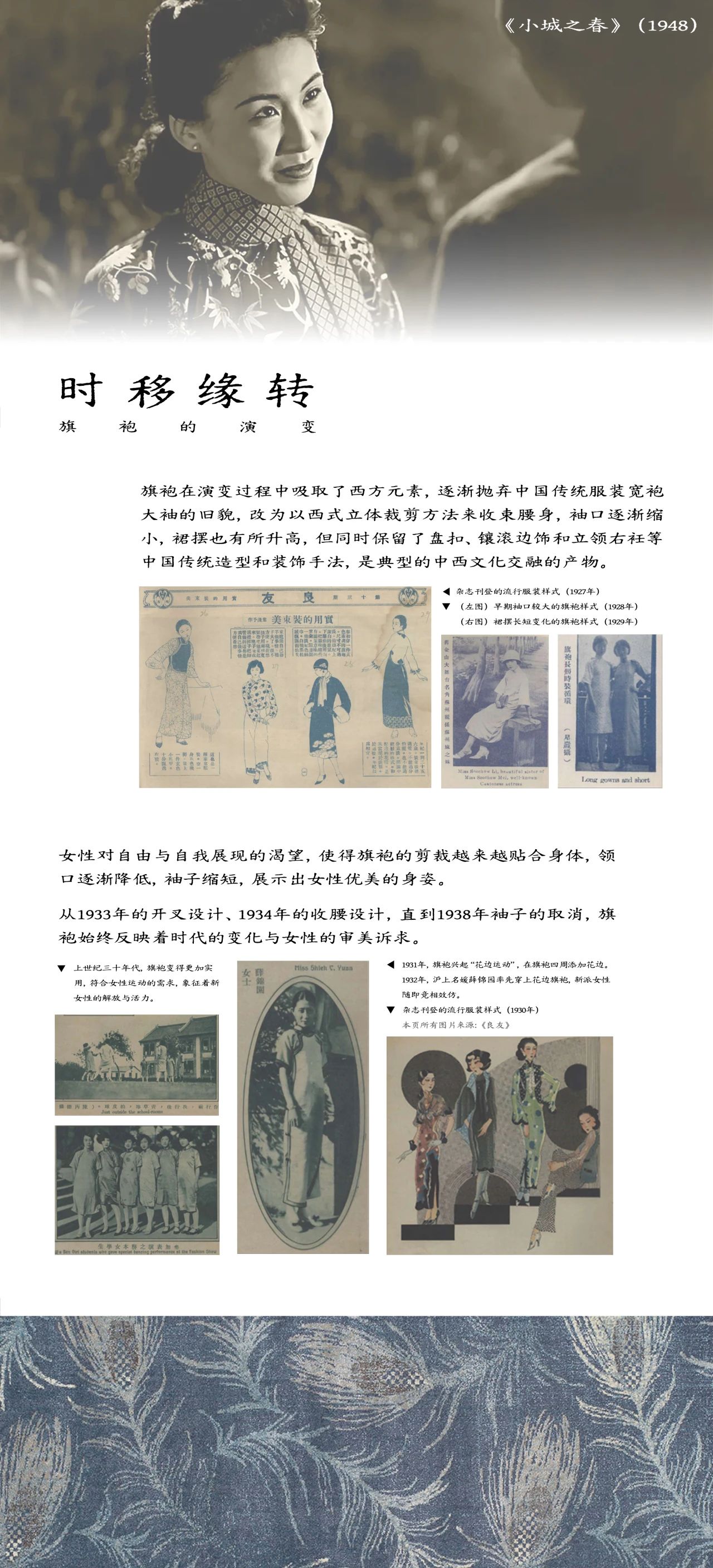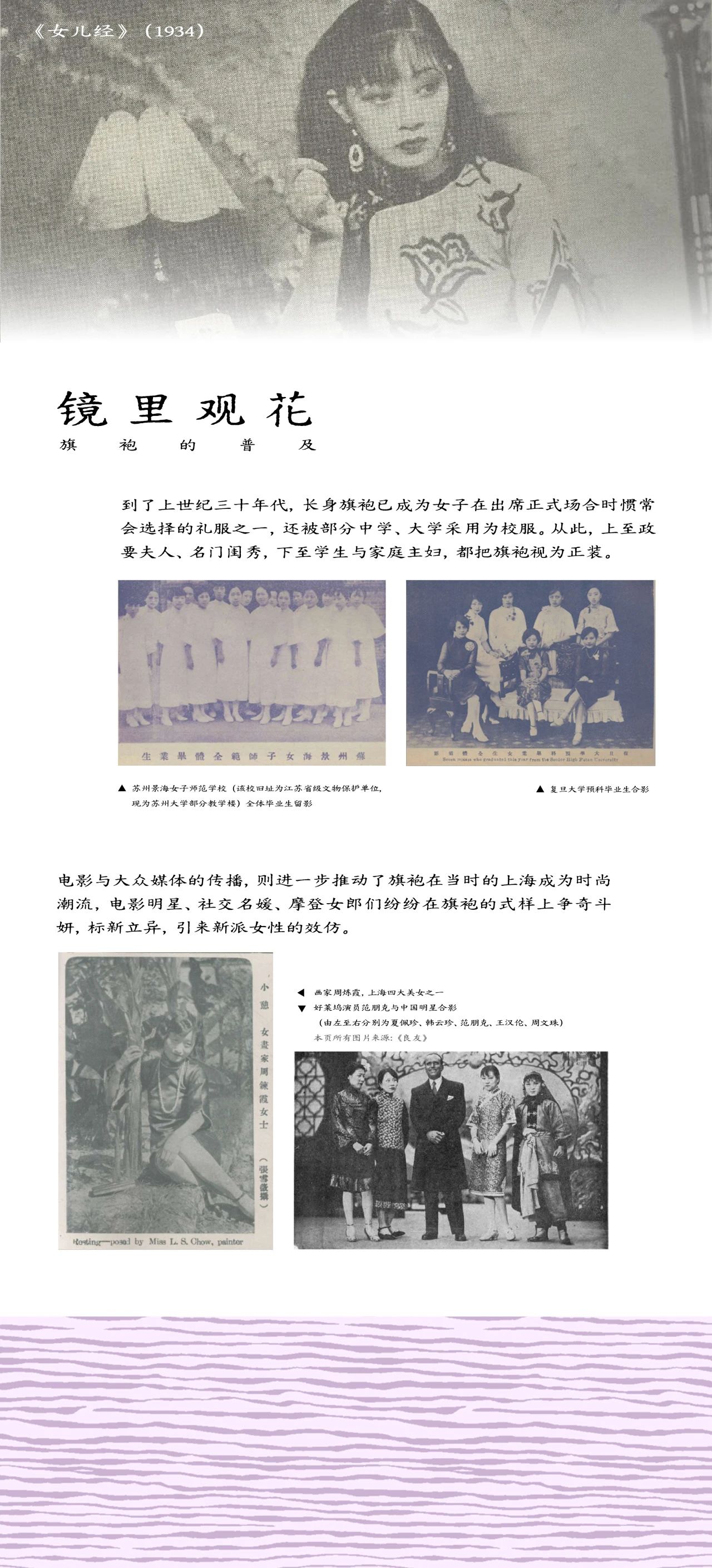 杂志《良友》封面上女明星穿着旗袍的时代风采,以及经典电影中女演员的旗袍造型,从而感受旗袍在光影艺术中的魅力。
