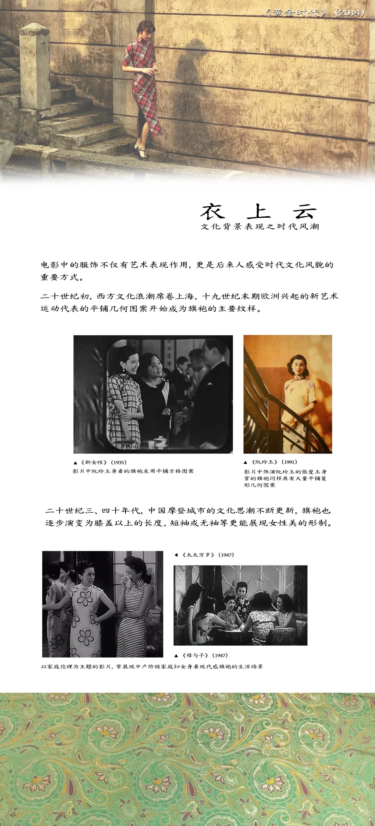 本章节的内容梳理了旗袍从初兴、普及到形制演变,回顾了旗袍作为东方文化符号在海外影视作品中的传播,最后也落脚当下,总结了旗袍在近年再次成为热门时装风潮的现象。通过这一章节,观众对旗袍历史演进过程有了深刻了解,也对旗袍在电影中的呈现有了初步认识,“国潮兴起”这一热门话题也能够使观众将旗袍与现实生活相结合,感受到更强的代入感。