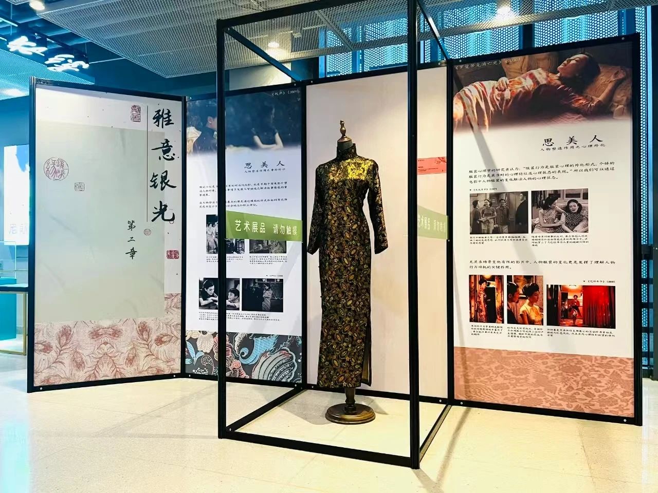 第二章“雅意银光”为旗袍在电影中的应用解读,包含五块展板,分别为:“思美人”人物塑造作用之身份标识、心理外化、情感表达以及“衣上云”文化背景表现之时代风潮、传统意义。本