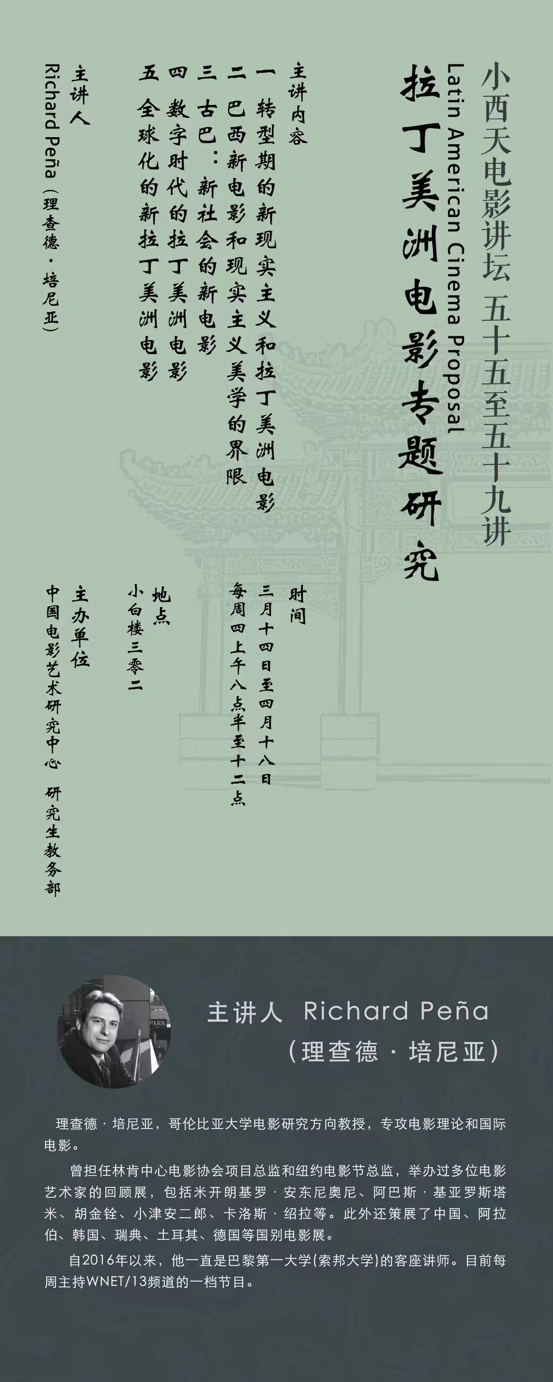 4月18日上午,由中国电影艺术研究中心研究生教务部主办的“小西天电影讲坛”第五十五至五十九讲《拉丁美洲电影专题研究》在小白楼302教室圆满结束。本次系列讲座邀请了哥伦比亚大学电影研究方向教授理查德·培尼亚(Richard Peña)与我中心学生进行深度交流与分享。