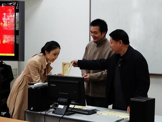 “第四届广电总局青年剧作扶持计划”颁奖暨“第五届新闻出版广电总局青年剧作扶持计划”剧作动员会于 2013年10月25日在研究生部教室召开。饶曙光副馆长代表馆(中心)领导为入选优秀剧作的同学颁发了证书,他对获得表彰的同学表示祝贺,并对辛勤辅导同学们的创作导师们表示感谢。他重申了总局对电影创作人才的重视与鼓励政策,号召全体同学把个人的成才与国家电影事业的需要结合起来,努力学习,努力实践,抓住机遇,尽快成长。皇甫宜川代表辅导老师们发了言,戴津代表剧作入选的同学发表获奖感言,丁涵代表新同学表达了积极参加剧本创作的迫切心情。